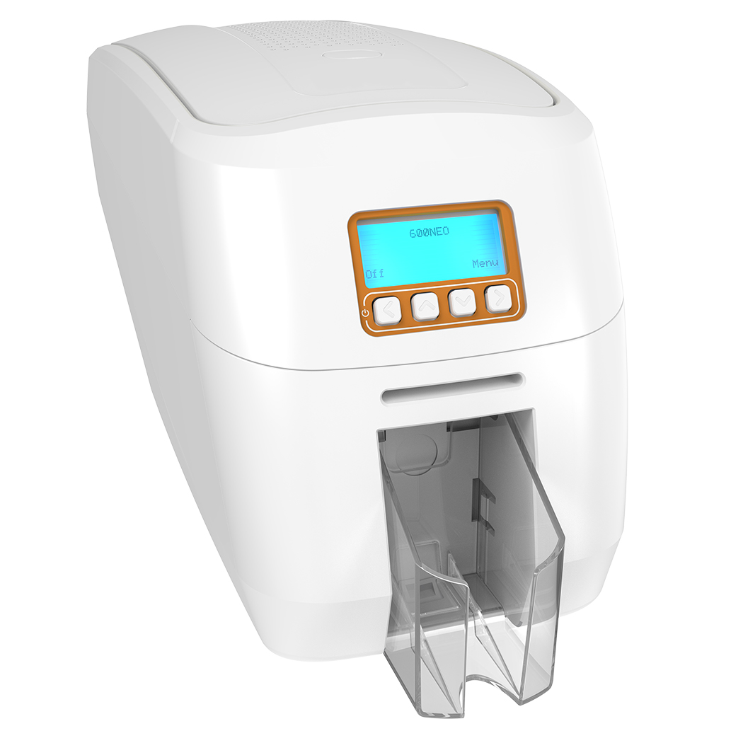 • Dankzij de transparante invoer- en uitvoerhopper kun je jouw printopdrachten in batches invoeren. Je hebt altijd goed zicht op het resterende aantal kaarten in de hopper.